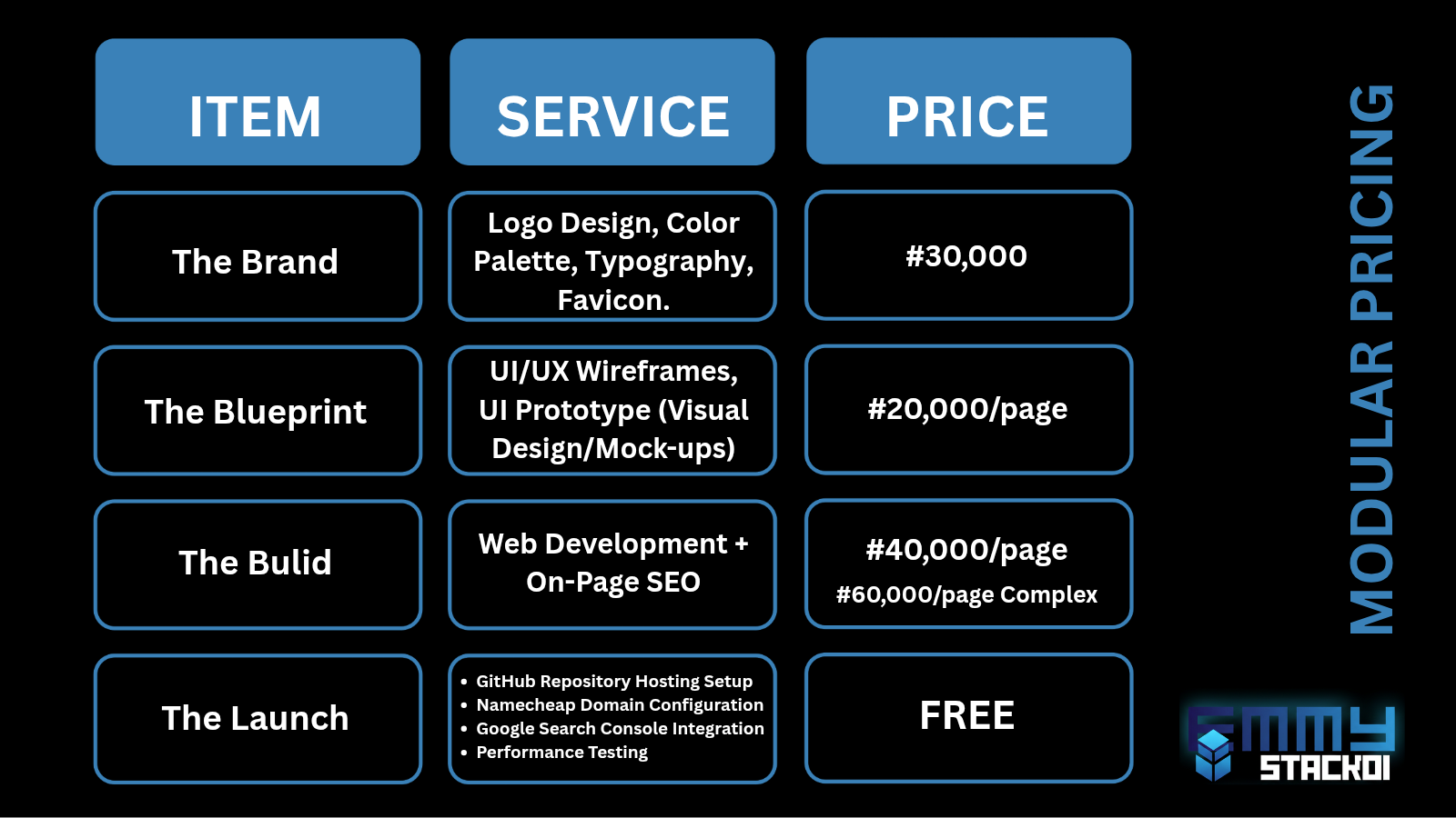 Emmy STACK01 is a one-stop digital agency specializing in high-performance website development and brand identity. We handle everything from UI/UX design and On-page SEO to the technical essentials—including free hosting via GitHub, domain configuration, and Google indexing. We manage the technical "heavy lifting" so you can focus on growing your business.
